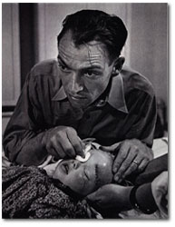 | ユージン・スミスの『ライフ』誌の仕事に「カントリー・ドクター」という名作フォト・エッセイがある。コロラド州クレムリン。デンバーから西へ115マイル。人口2000人ほどの小さな町のたった一人の医者、32歳の“何でも屋”の一般開業医を取材したものである。 名前はアーネスト・セリアーニ。何でも屋というのは、内科から始まって精神科や歯科までのあらゆる分野の知識を身に付けた上で治療に携わらなければならないからだ。彼の診療は朝8時から始めて、夜中に終わるというのは特に珍しいことではなかった。それだけ忙しくても、報酬は都会の専門医よりも安かった。 しかしセリアーニにとってそれに変わるものが田舎町にはあった。患者や隣人たちから必要とされていること。地域社会で高い社会的地位を得ていること。そしてうるさい上司がいないからすべてを自分の判断でできるという対価があること。 1948年ユージン・スミスは『ライフ』誌からコロラド州の小さな町の医師を撮影する依頼をうけた。彼はセリアーニに会ってすぐに意気投合し、密着取材と撮影が始まった。 ユージン・スミスは第二次世界大戦後、責任と高い道徳性を備えた慎重で正確なジャーナリズムにのっとり、複数の写真を使って自分の考えを表現するフォト・エッセイという手段を、より深化させようと考えていた。しかし彼がどう主張してもライフ誌は与えられたテーマの写真だけを撮るのが写真家で、記事にするのが編集者という考えを変えなかった。だから彼はいつも衝突した。彼のフォト・エッセイの考え方は記事の内容を書くことから写真のセレクト・レイアウトまで、伝えたいことが正確に伝わるようにすべてにおいて彼が責任を負う方法だった。やっとのことで彼が勝ち取り“穏やかで力強い手法と確固たるヒューマニズム”その独自の手法を貫いて出来上がったのが、この「カントリー・ドクター」である。 私が説明するより写真家の確かなテキストからのいくつか紹介してみようと思う。 リー・マリー・ホウイートリー。馬に頭を蹴られた2歳半の彼女の頭がい骨の骨折箇所を調べ額の大きな傷は縫合した。セリアーニはできるだけの手当はしたけれど、彼ができることはここまでである。彼女の潰れた左の目を救ってやることはできない。彼はそのことを両親になんと伝えたらいいのか言葉を探した。 |
