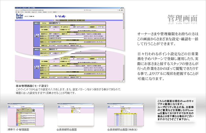 日々行われるポイント設定などの日常業務を予めパターンで登録し運用したり、実際にお客さまと接するスタッフの皆さんが行った作業をさかのぼって閲覧できたりする事で、よりリアルに現状を把握することが可能になります。