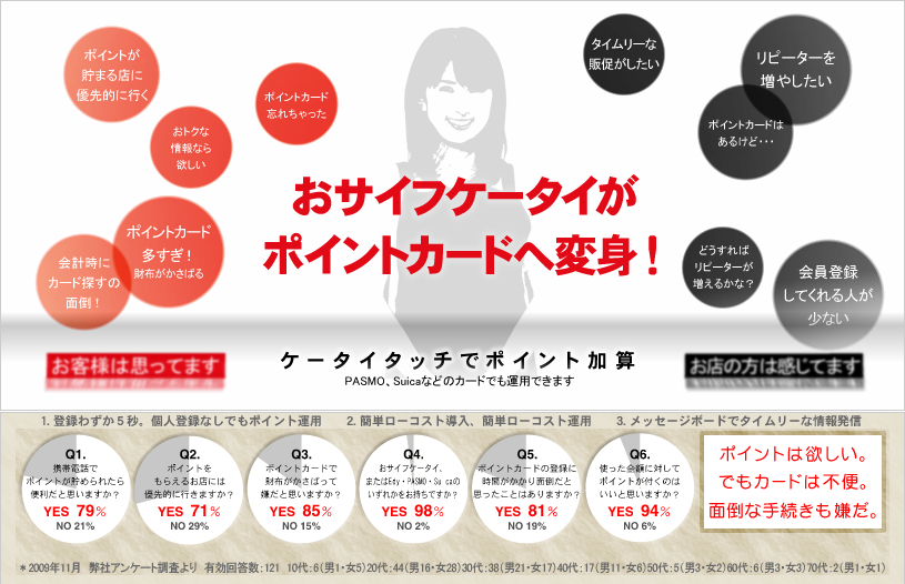 当システムは、おサイフケータイ、PASMO、Suica等が採用しているICカード(フェリカチップ)のICカードNo.をリーダーで読取り、サーバー上でポイントを付与します。