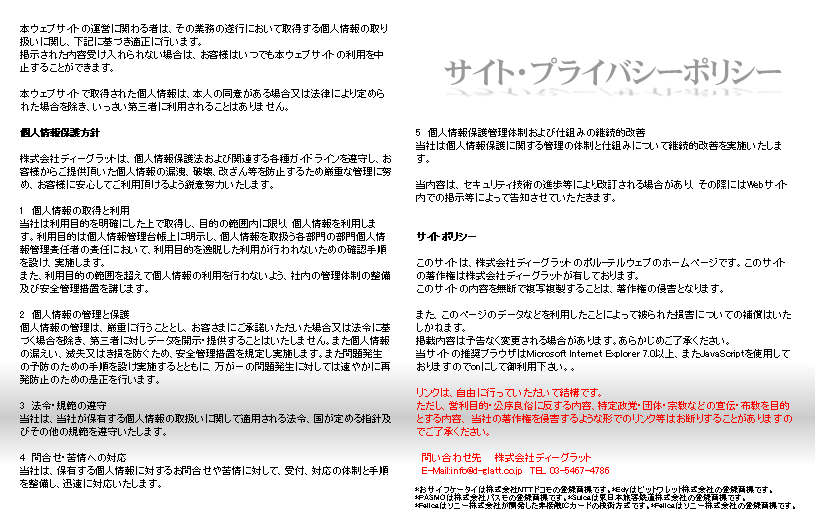 株式会社ディーグラットは、個人情報保護法および関連する各種ガイドラインを遵守し、お客様からご提供頂いた個人情報の漏洩、破壊、改ざん等を防止するため厳重な管理に努め、お客様に安心してご利用頂けるよう鋭意努力いたします。