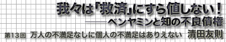とはいえ、いましがた論じたように、その答えもまた我々の楽しい余暇を乱さぬよう、すでに前もって用意されており、我々が「自身の名」という「主体思想」に基づいて判断しようとするかぎり、それが「真の満足」であることに疑いの差し挟みようはない。我々は北朝鮮による拉致被害者たちの変わり果てた洗脳ぶりを見てまるで他人事のように哀れんでいるが、自分のことを棚に上げる余裕を持つ点では実は彼らよりも過酷な思想改造を受けているのかもしれない。それに洗脳をあえて否定しなければならないほど毎日の生活に困窮していない我々は、北朝鮮人の窮乏ぶりを哀れみながらも自分たちには「万人の満足」がかなりの程度かなえられていると内心悦に浸ってもいる。もちろんここでいう「かなりの程度」とは、「満足」の度合いというよりは「万人」の地理政治学的(geopolitical)範囲、いや縄張りであり、実際に餓死の危機に直面している北朝鮮やアフガニスタンの民衆や自国内の被生活保護の母子家庭やホームレスたちは最初から「万人」の範疇から除外される。その証拠に、我々は同時多発テロで殺された「我々のヒーロー」たちには同じ「万人」の一人として怒りと悲しみの涙を惜しみなく流せても、ソマリアの荒れ果てた村でただ死を待つばかりのハエにたかられた栄養失調児に対してはせいぜい「人道支援」や「難民援助」といった普段使い慣れない言葉をよそよそしく(それもテレビ画面越しに)吐く程度であり、国内の隣近所にいる(二極化の波に溺れた)「経済難民」にいたっては、そうした言葉すらない――あるとすれば「自業自得」ぐらいか!――のが現状である。