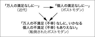 この不可解で不条理な定言の持つ意味がもし分かりにくければ、単純にいまワシントン市内のあらゆる公共の場所で死の恐怖におびえている市民の立場に身を置いてみるとよい。彼らがライフル銃の標的にさらされていることに「身に覚えがある」のは、なにも人の恨みを買うようなことをしでかしたからではなく、ただ単に彼らが善良な一市民、ひいては「万人」の一人だからである。しかしなぜ「万人」でなければならないのか? これを理解するには、この定言が「個人の不満足(不幸)なしに、いかなる万人の不満足(不幸)もありえない」というもう一つの論理上の可能性としてはありうる定言ではないことを押さえる必要がある。たとえば、かつてケネディー大統領が暗殺されたとき、我々「万人」はそれをまるで自分の家族の死のように嘆き悲しんだものだったが、もし仮に同じことがブッシュ大統領や小泉首相に起きた場合、我々はかつてと同様の悲しみに打ちひしがれることができるだろうか? もしできるとしたら、いまも要人暗殺は起こっているはずだが実際には起きておらず、またそうである以上、この定言の実効性はいまや失われたものとみて差し支えなく、これをひとつの論理的帰結として証明することもけだし可能である。上の図式に照らせば、この定言は「万人の満足なしに」の否定形として働くことになるはずだが、実際に後者を否定、いや転倒したのはそれではなく「個人の満足なしに……」というポストモダン理念である。ようするに、止揚が「個人の不満足なしに……」ではなく「万人の不満足なしに……」となるのは、止揚が直接的にはポストモダンの否定もしくは転倒のかたちをとるからであり、しかもこのポストモダン社会が全体として否定される兆しのまだない今日、それが否定ではなく転倒となるのは理の当然である。