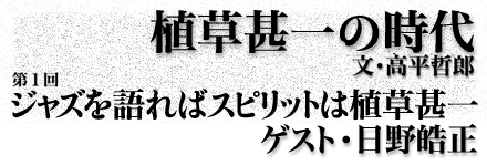 ■アート・ブレイキーはぼくの父親 最初に植草さんがジャズを聴きだしたのは、MJQの『大運河』、ジャズ・メッセンジャーズの『危険な関係』『殺られる』、マイルス・デイヴィスの『死刑台のエレベーター』などのジャズが映画に使われ始めたころだ。日野皓正はそういうジャズをどんな風に聴いていたのだろうか? いやーかっこいいなと思ってさ。まだ若かったしさ、十代だし。やっぱり『死刑台のエレベーター』、『墓に唾をかけろ』のテーマ曲の『褐色のブルース』、『大運河』……あのころいっぱいあったけど、やっぱり『スイング・ジャーナル』でさ、映画の記事が出ると、えーって思って観てさ。わぁ、かっこいいなぁって……そういうのがすごい強かった。それと『サンジェルマン・デュプレのアート・ブレイキーとジャズメッセンジャーズ』って二枚組のLP、あれもそうだし。『モーニン』もそうだし……。 ■すごい真心のある人だった やっぱりいちばん思い出すのは、草月会館のぼくの『ハイノロジー』のコンサートだよね。あのとき先生に「ゲストで出て下さい」ってお願いして。演奏して、途中で植草甚一先生ですって紹介したら出てきて「なに喋っていいかわかんないし、どうしよう……」とか言いながら、音楽に関係あったんだかないんだか、難しい話をしてねぇ(笑)。それでぼくも、相槌打とうにも打てないわけ。なんの話なんだかよくわかんないなぁみたいな(笑)。難しくて、ただはいはい言って聞いてたっていう……。アレン・ギンズバーグの話だったのかな、あの辺ヒッピーの時代だったけどね。それで、とんちんかんな会話なんだけど、結構評判よかったんだよね。あの時代、ゲストってのがだいたい受けたし。 あるとき、植草さんが気に入らない日野さんのコンサートがあった。七三年の郵便貯金ホールの『ビー・アンド・ノウ』だった。いちばん前の席で緞帳が降りて、ぼくは「楽屋に行きますか?」と聞いた。なんだか植草さんは怒っていて「なんで楽屋に行くんですか。楽屋行ってぼくは、日野くんにどうでしたって聞かれたら、なんて答えたらいいんです」と言って他の客をかき分けるようにして出口に向かった。 そういう気持ちってわかるよね。すごいわかる。誰に、なにに怒ってたんだろう。ちょっとさぁ、ファロア・サンダースみたいなさ、変なフリーとも何ともつかないことをやってたんだよね、俺。そういう意味で、なんだ日野はって、ほんとは思ったんだと思うのね。だから、うれしいよね。 「反対にさ、ぼくから高平さんに聞いた方が植草さんのことわかると思うんだけど……。どういう感性だったんだろう? たとえば政治みたいなものはさ、嫌がってたのかとかさ……」 なるほどね、それはよくわかるよね。やっぱりさ、ぼくたちも思うけど、自分たちが批評される立場だと思うと、最低条件、人間的で人を包むだけの暖かさがある人に批評されたいと思うよね。「ここの部分よかったけども、でもね、ここにもう一つなんか入ればいいんじゃないの」とかさ。「ここはすごく嫌いだったな」とか、そういう風に言ってくれれば、ほんとにいいなってね。そんなふうに言われれば、俺もそう思ってたんだとか思うじゃない。だから昔「日野は会ったらぶっ飛ばしてやる」みたいな批評、書いてあるの見たら、こいつはなにを根拠に言ってるんだって思ったよね。 ■ジャズを語ればスピリットは植草甚一 マイルスが電気楽器で登場した『ビッチェズ・ブルー』は植草さんにとってはショックだった。各誌で植草さんは高い評価をしたが、日野さんはどう思ったのだろう? 『ビッチェズ・ブルー』? そんなに覚えてないんだけどさ。……ぼくねぇ、あのころだと思うんだけど、チック・コリアとアイアート・モレイラとデーブ・ホランドとジャック・ディジョネットとウエイン・ショーター、そのシックステットを六九年か七〇年にニューヨークに行ったときに見て聴いてるわけ。そのちょっと後だよね、『ビッチェズ・ブルー』が出てきたのは。だからああいうふうに、ディジョネットが叩いてるときにリアルタイムで見てるから、ショックなんてもんじゃなくて……。七〇年の大阪のエキスポの時に、国際ジャズフェスティバルっていうのをやったんだけど、ぼく自身はアメリカから帰ってきたばかりだからマイルスのまったくの真似。弟も、ジャック・ディジョネットを聴いてきて、びっくりして口、ぽかんと開けてたくらいだから、その通りやって。それでダニエル・イメールに「日野はなんでマイルスの真似しなくちゃいけないんだ」って、すごい批評やられたわけ。そんで、みんなもう口もきいてくんないの(笑)。 「植草さんが奥さんのことを、梅子さんをね。梅公って呼んでたの(笑)。俺はこいつを梅公って呼ぶんだって(笑)」 ■エンターテイナーは教祖でもある たまにね。なんかさ、何十年も俺を見てないような、おばさんやおじさんが来てさ「日野さんって言